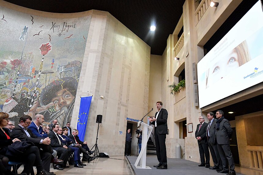 C’est à l’hôtel communautaire qu’a eu lieu cette année la cérémonie des vœux 2019 au monde économique. L’occasion pour les présidents de la Communauté urbaine, du Grand Port Maritime de Dunkerque, de la Chambre de Commerce et d'Industrie Littoral Hauts-de-France, de la commission territoriale de Dunkerque de la Chambre des métiers et de l’artisanat des Hauts-de-France, ainsi que tous les acteurs économiques du territoire de se retrouver pour dresser le bilan de l’année écoulée et évoquer les perspectives pour les mois à venir.