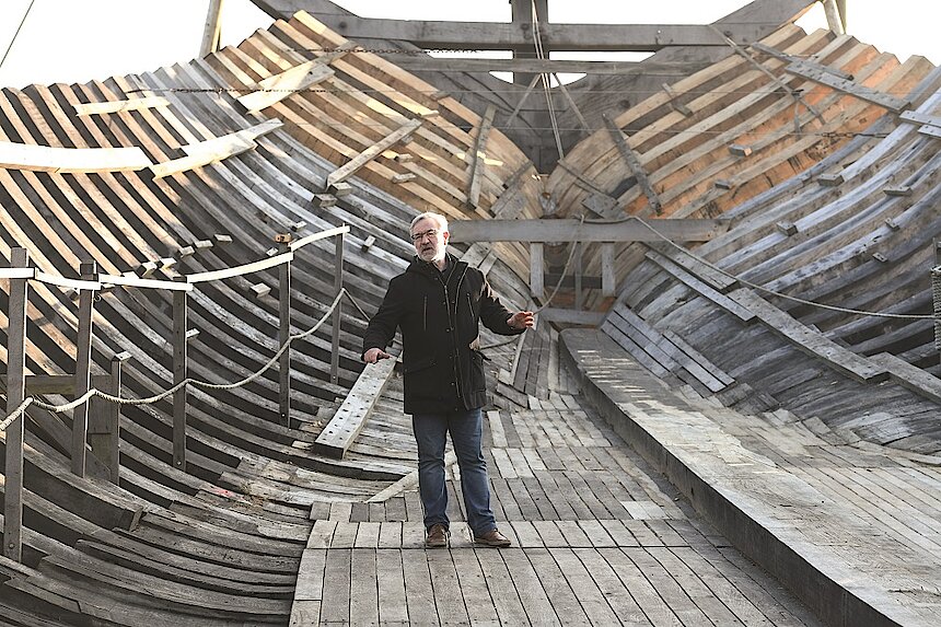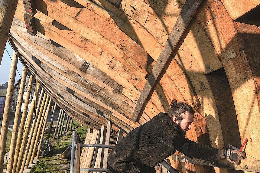 Le « Jean-Bart », vaisseau du XVIIe siècle actuellement en construction à taille réelle à l’Espace Tourville à Gravelines, s’est vu ajouter une pièce maîtresse il y a quelques semaines. « Nos charpentiers de marine ont posé les deux derniers couples à l’arrière jusqu'à l’arcasse, sur laquelle viendra se positionner le château arrière », détaille Christian Cardin, président de l’association qui s’est lancé dans ce projet un peu fou il y a plus de vingt ans maintenant. Effet visuel garanti pour qui monte sur ce navire, dont la construction est encore loin d’être achevée, mais qui impressionne déjà par sa carrure hors norme. « Avec ses 17 mètres de hauteur et sa largeur de 15 mètres, ce sera une véritable cathédrale des mers », pronostique Christian Cardin.