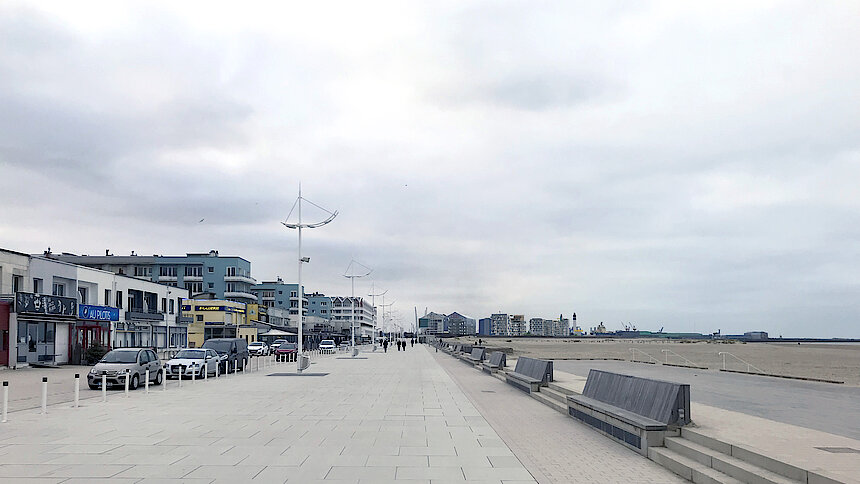 Dès 2015, Patrice Vergriete l’annonçait : la digue de Dunkerque allait se refaire une beauté. Sept ans plus tard, la façade maritime de Dunkerque est transformée ! Cette rénovation, entamée en 2016 par une grande concertation, s’est concrétisée dès janvier 2018 avec le démarrage des travaux digue des Alliés. Entre janvier 2018 et juillet 2019, la promenade qui mène de la passerelle du Grand Large au parvis du Kursaal s’est métamorphosée : nouveau dallage, murets anti-submersion sur lesquels viennent s’adosser bancs, solariums, terrasses sur pilotis, sans oublier le gradin de la place du Centenaire, ont donné un second souffle à la digue des Alliés ! En mars 2021, les travaux ont repris digue de Mer.