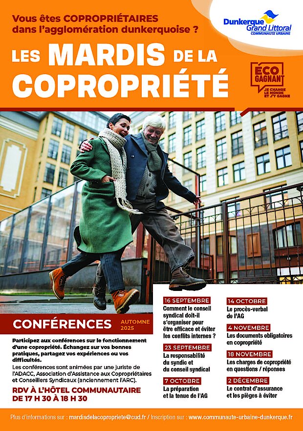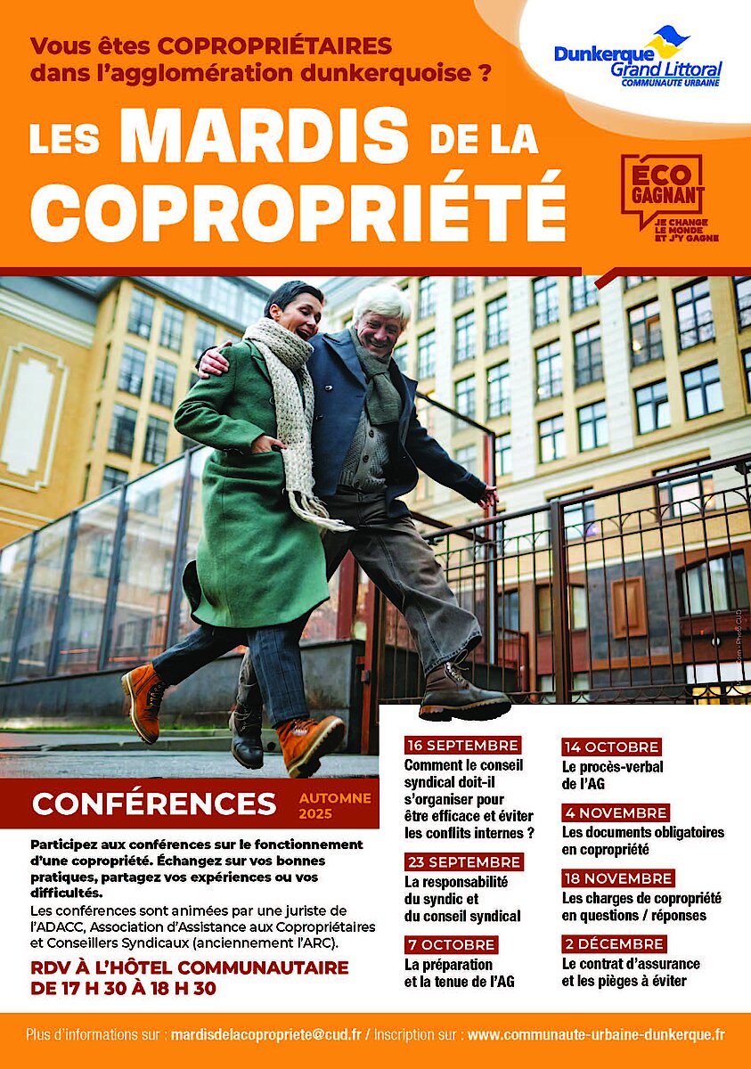 La Communauté urbaine de Dunkerque vous propose du 16 septembre au 02 décembre des conférences animées par une juriste de l'ADACC, Association d'Assistance aux Copropriétaires et Conseillers Syndicaux, anciennement l'ARC.