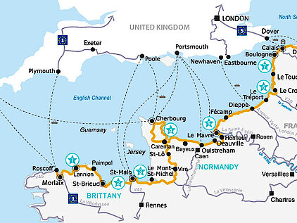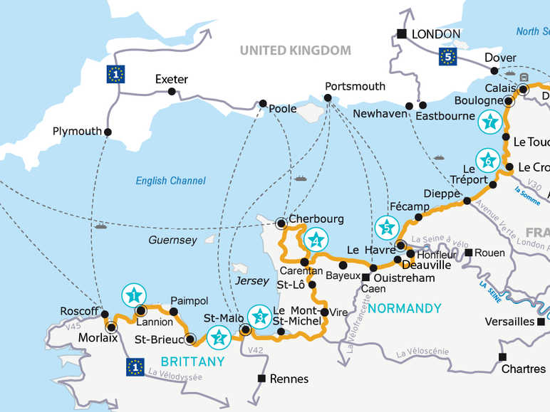 ► La Vélomaritime constitue la partie française de l’EuroVelo 4 qui parcourt l’Europe jusqu’à Kiev en Ukraine.
